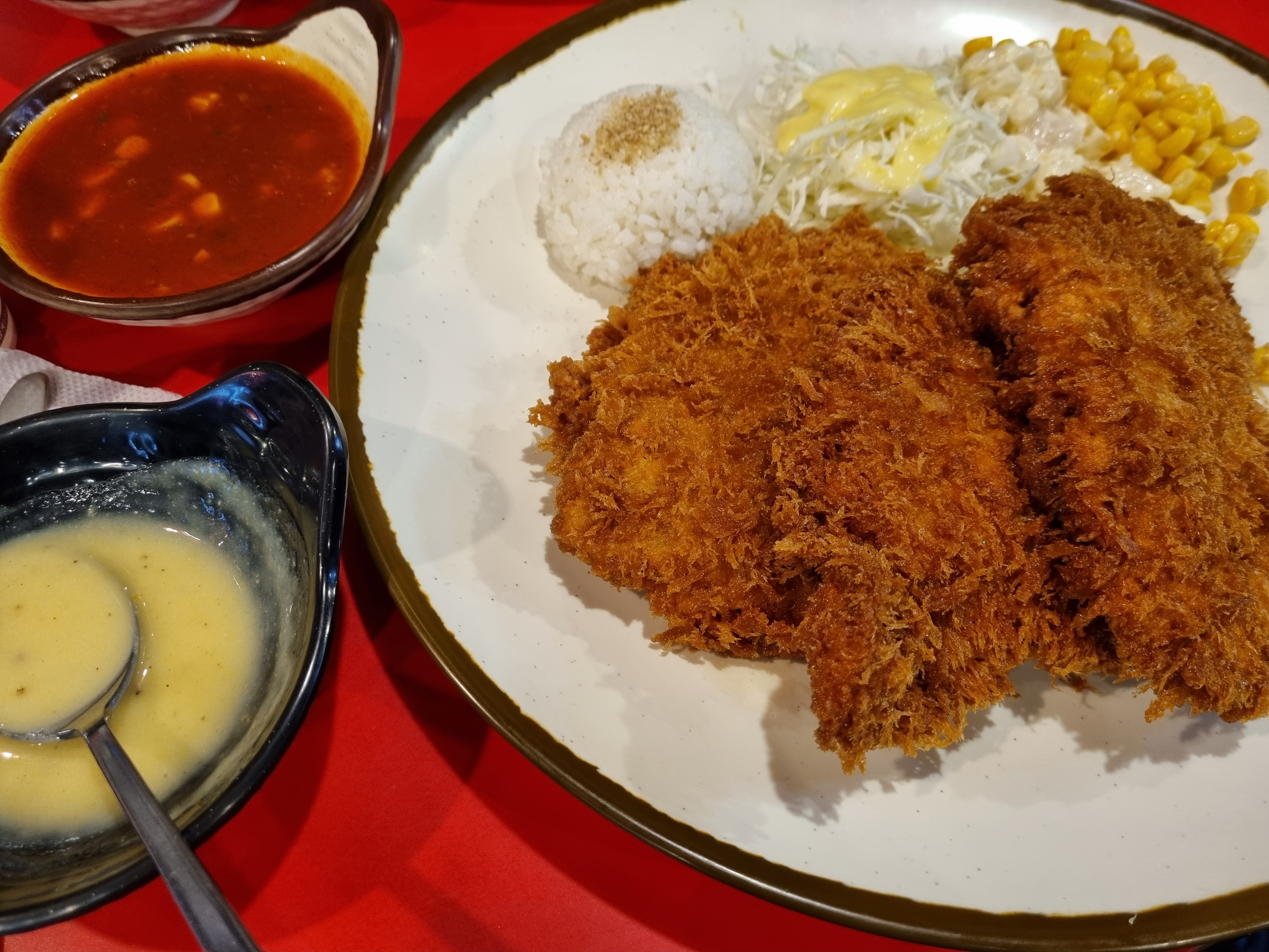 키오스크로 주문하고 나면 옥수수스프를 주신당 키오스크는 언제 도입된거지...? 그 뒤 매운돈까스 소스를 주는데 옥수수가 들어있는 게 특징. 안매운소스도 있다고 하는데 메뉴에는 없어서 따로 얘기해야하는 것으로 알고 있음 돈까스는 두꺼운 패티고 세장이나 주신다. 소스는 매콤/매움/무진장매움이 있는데 매콤으로도 적당한듯 합니다. 요즘 위가 쓰리네요 매운거 먹으면 ㅋㅋㅋㅋㅋㅋㅋ 옆에 고추가루도 있어서 소스 매움 정도도 조절할 수 있는 듯 돈까스도 맛있고 클래식하지만 샐러드도 맛있습니다. 양이 많아서 리필하진 않았지만 밥도 무한 제공이라고 하니 좋은듯 ㅎㅎ